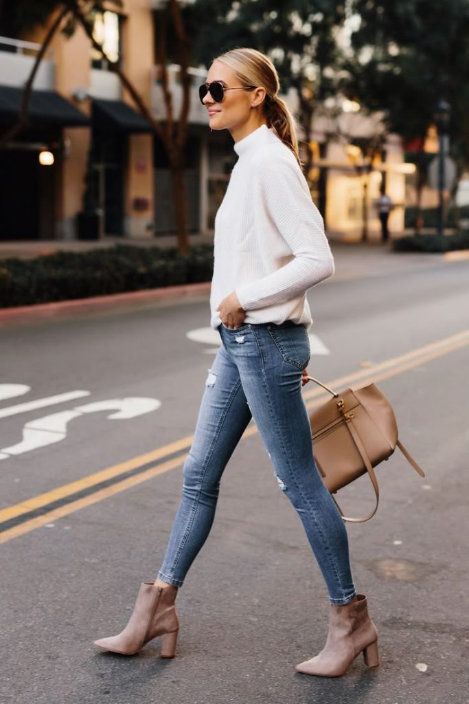 A white turtleneck sweater tucked into light-wash skinny jeans creates an elongated silhouette. The taupe heeled ankle boots and structured brown handbag elevate the look, making it ideal for both work casual and dress classy settings.