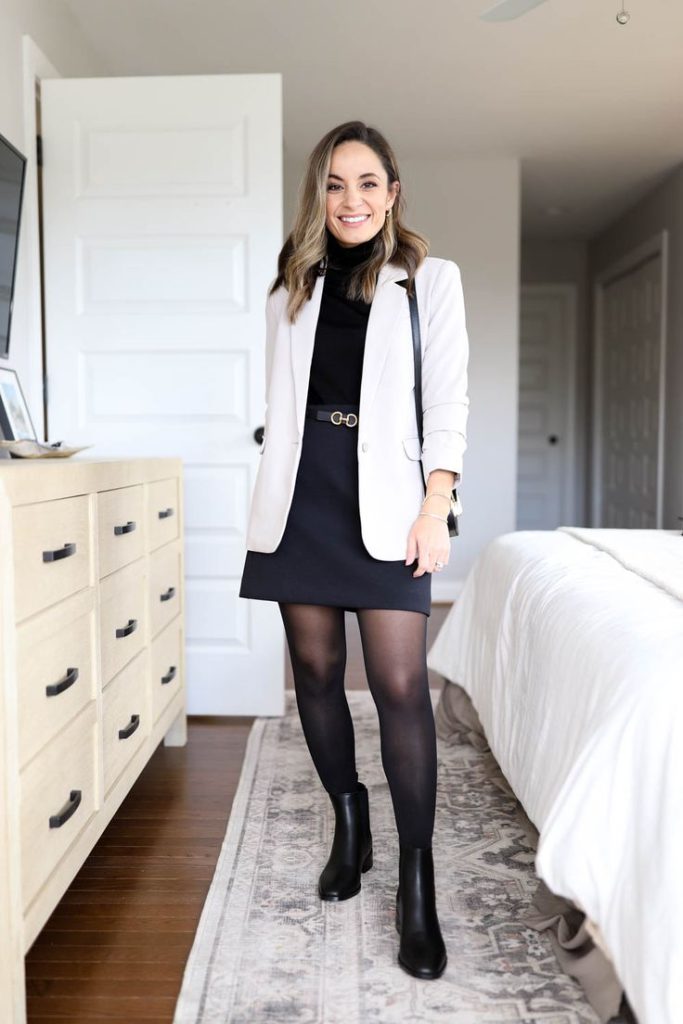 A structured white blazer over a black turtleneck dress creates a refined and sophisticated work chic ensemble. The black heeled ankle boots bring the outfit together, making it a perfect choice for the office or formal gatherings.