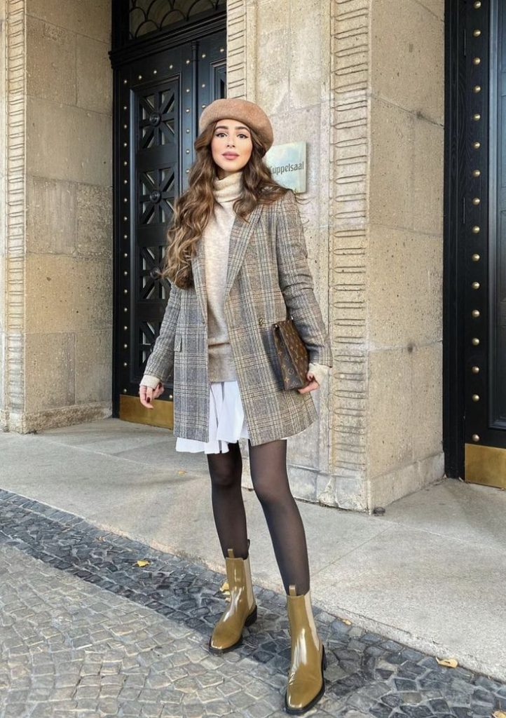 If you’re looking for casual classy winter fashion inspiration, this layered outfit is an absolute winner. A beige turtleneck, plaid oversized blazer, and a white skirt offer a mix of textures, making this look effortlessly stylish. The Chelsea boots in an earthy taupe tone add a Western touch while maintaining a polished appeal. Perfect for a seasonal stroll through the city or a chic work outfit in 2025.