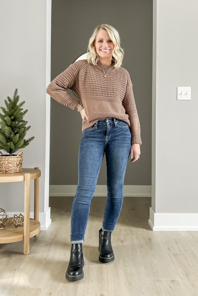 For an everyday casual outfit, a textured brown sweater paired with jeans and black flat ankle boots is the way to go. This look is perfect for running errands, casual outings, or cozying up in a coffee shop during fall or spring. The neutral tones keep it versatile, and the chunky boots ensure comfort.