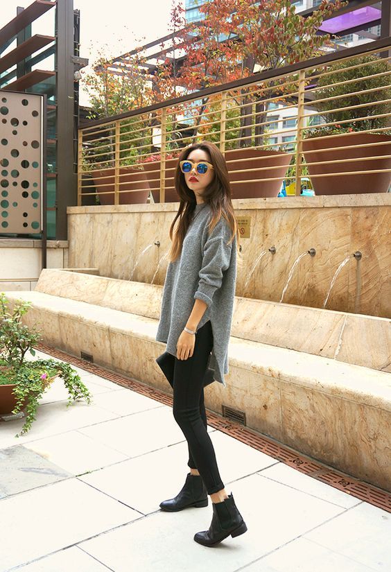 Oversized sweaters are a must-have for casual winter days. This gray asymmetrical knit pairs effortlessly with black skinny jeans, while the flat black Chelsea boots keep things stylish yet comfortable. This look is an ideal blend of dress casual and Western chic, making it a great go-to for weekends in the city.