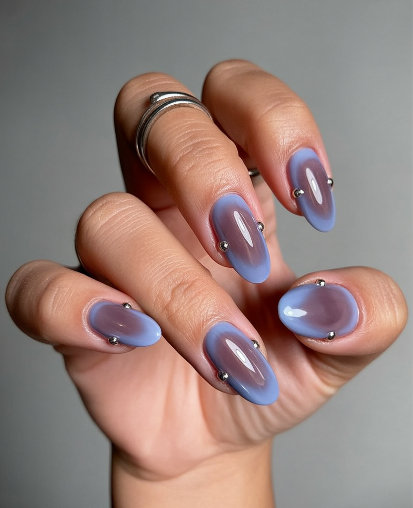 Comparison: versus full rhinestones or chrome, micro studs give just enough texture while letting the color lead. If you like modern details, this combo delivers statement energy with minimal bulk. Ask for soft blue aura layers first, cure, then place tiny caviar studs before sealing with a top coat.