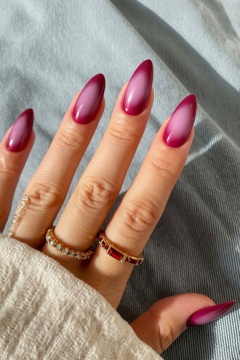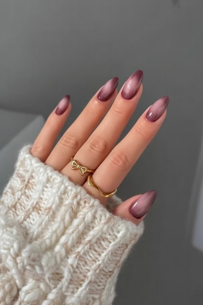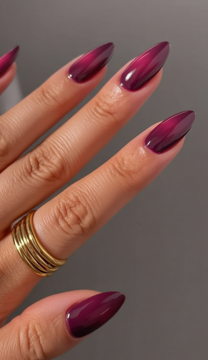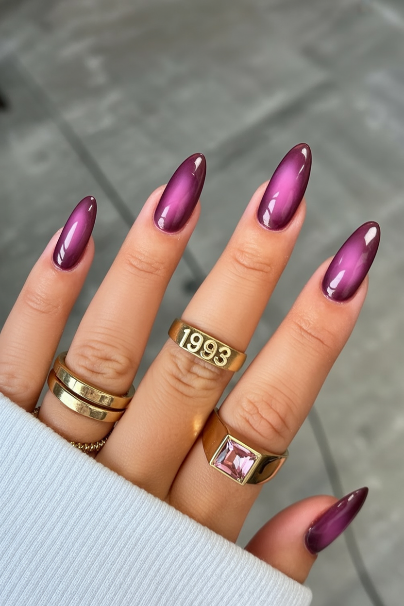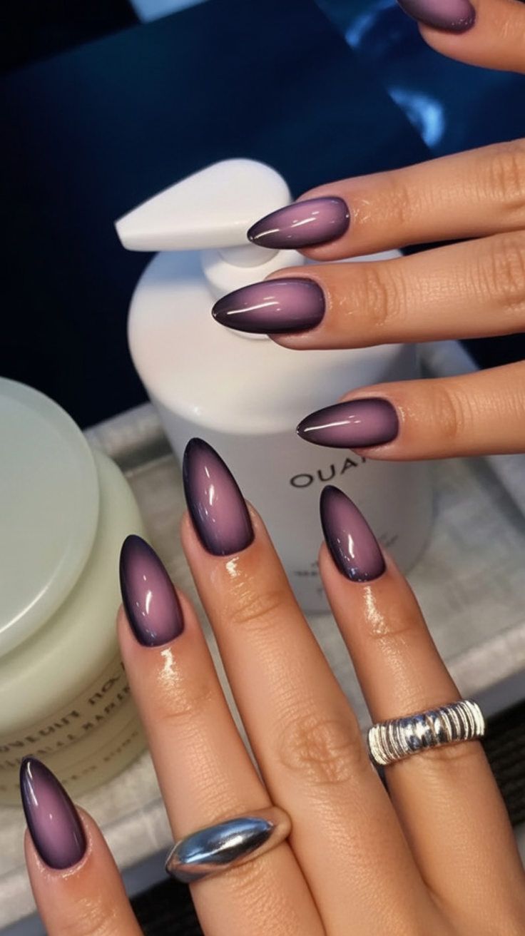 What makes it special: the gradient is concentrated around the belly of the nail, so the glow feels soft rather than graphic. That placement elongates the nail and looks expensive. Ask for thin layers of sheer plum, building depth at the sides and leaving the center lighter—then cap with a bright top coat for that reflective finish.