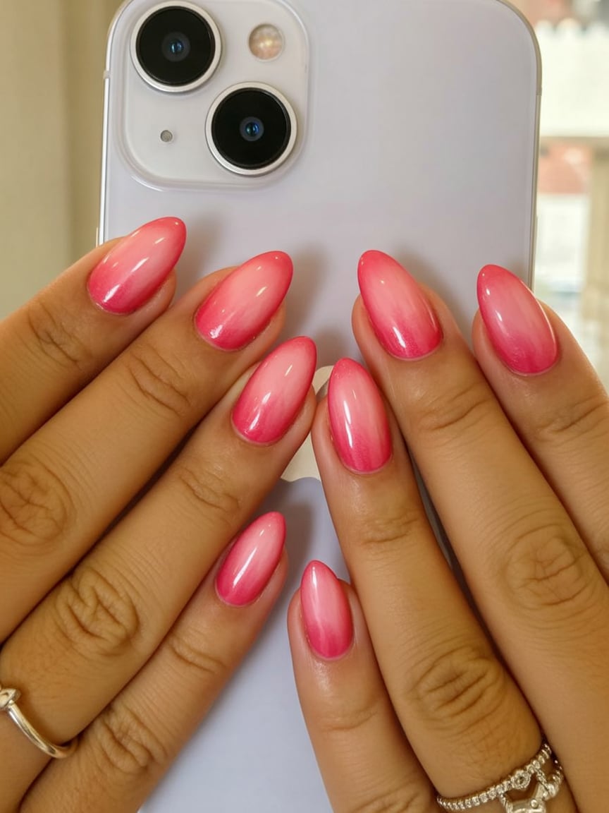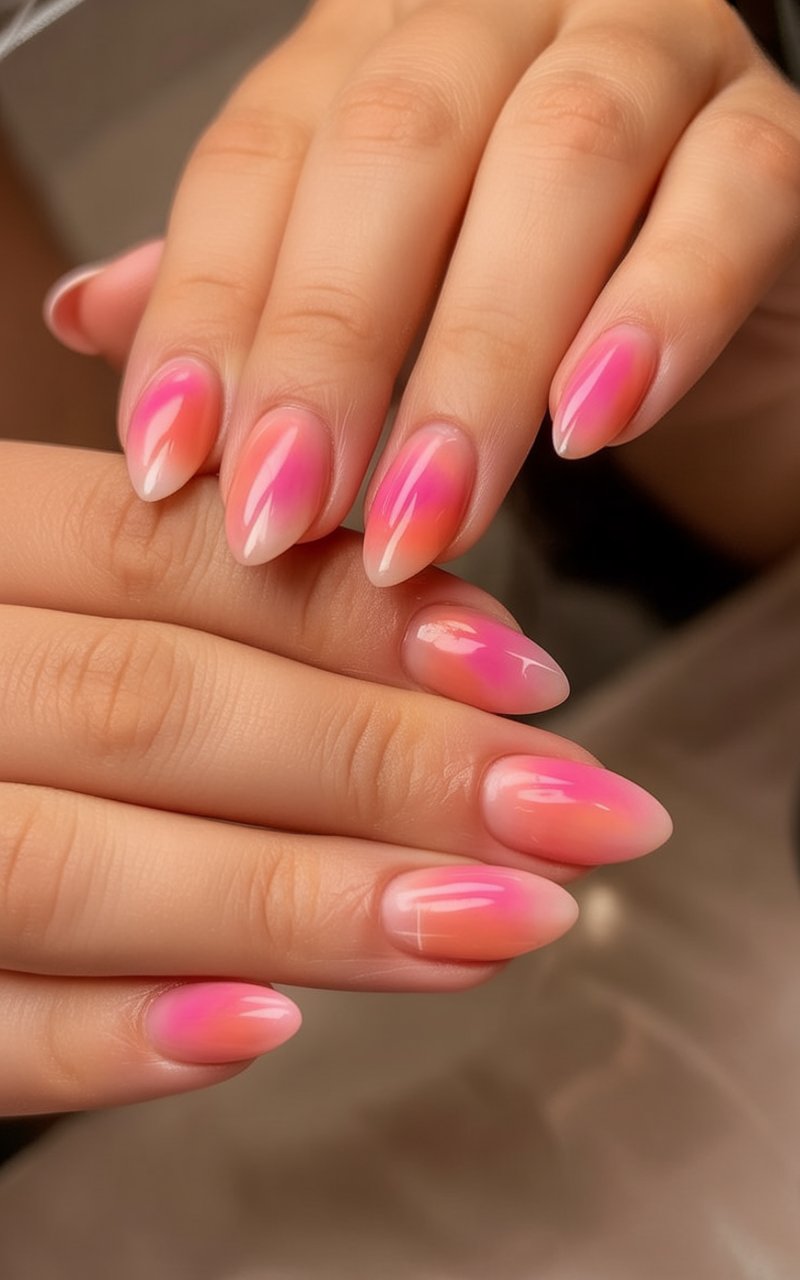 This bright aura melts from hot pink into a soft peachy center, like a tiny sunset cupped on each fingertip. The glow feels playful and a little flirty—perfect for summer selfies and nights when you want color to do the talking. The almond shape keeps everything elegant, so even a bold shade reads chic rather than loud. If you’ve been craving color therapy, this pink aura is instant mood-lifting magic.