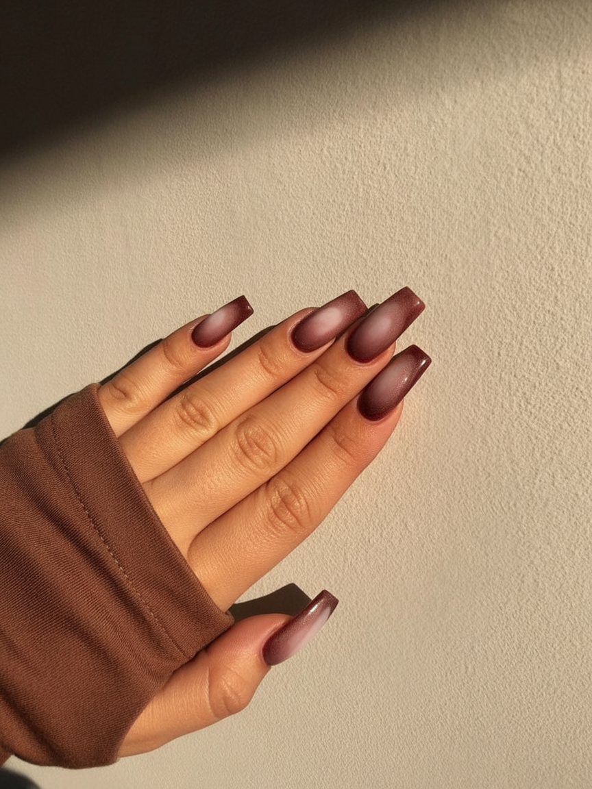 Who it’s for: perfect if you prefer simple polish that still feels special. Brown gradients suit every skin tone, especially medium to deep, and the longer square balances wider nail beds. Ask your tech for sheer cocoa around the edges with a lighter taupe center, then finish with a matte top to keep the effect soft and elegant.