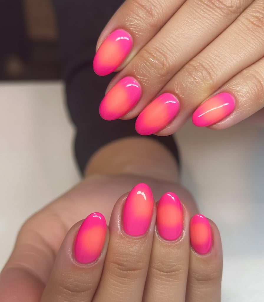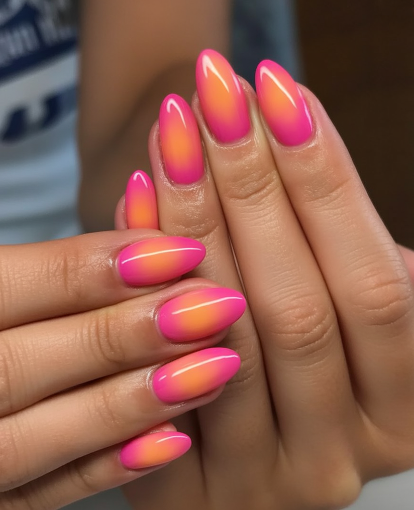This aura glows like summer’s golden hour—hot pink melting into a peachy halo that feels bright and happy. The almond shape adds a little lift to every gesture, and the high-gloss finish turns the blend into liquid light. It’s playful without being childish, the manicure that makes even a tee and jeans look styled.