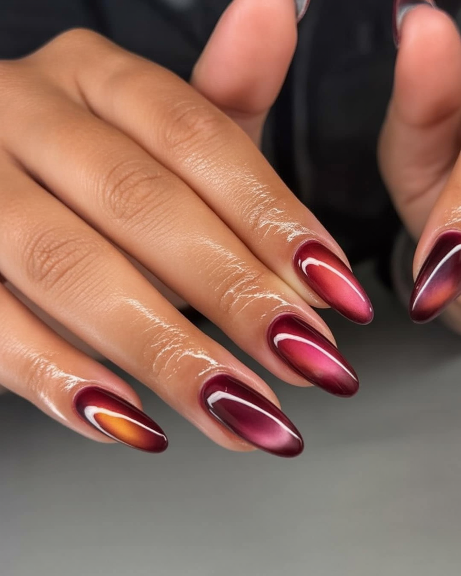 Rich wine tones circle a warm center so the nails look like tiny gemstones. One or two nails catch a fiery sunset gleam, shifting from red to a glowing orange ember—dramatic without losing polish. It’s confident, grown-up glam that loves a gold ring stack and a glassy topcoat.