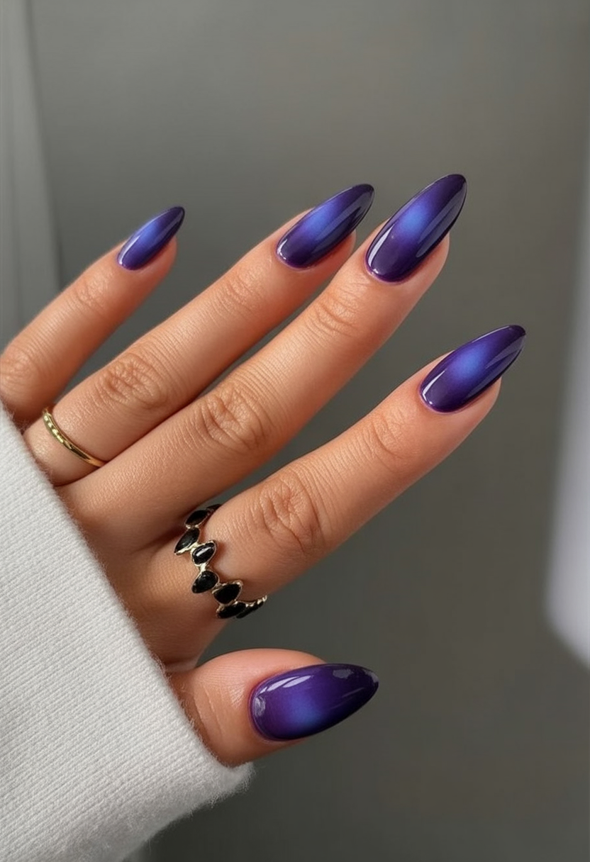A deep indigo rim softens into a luminous violet center, creating an eclipse effect that’s equal parts edgy and elegant. The shine is mirror-smooth, so the gradient looks almost dimensional. It’s a confident purple that flatters both silver and gold jewelry and transitions seamlessly from desk to dinner.