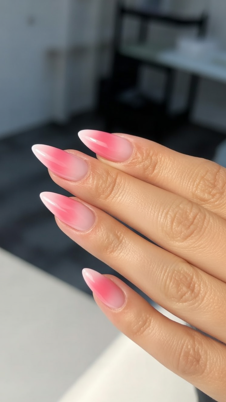 Feather-light pink diffuses toward a milky center, creating a delicate glow that feels romantic and clean. The tapered tips bring a little edge, so this isn’t saccharine—just polished and pretty. It’s the manicure you choose when you want to look put-together without trying, the definition of simple and feminine.