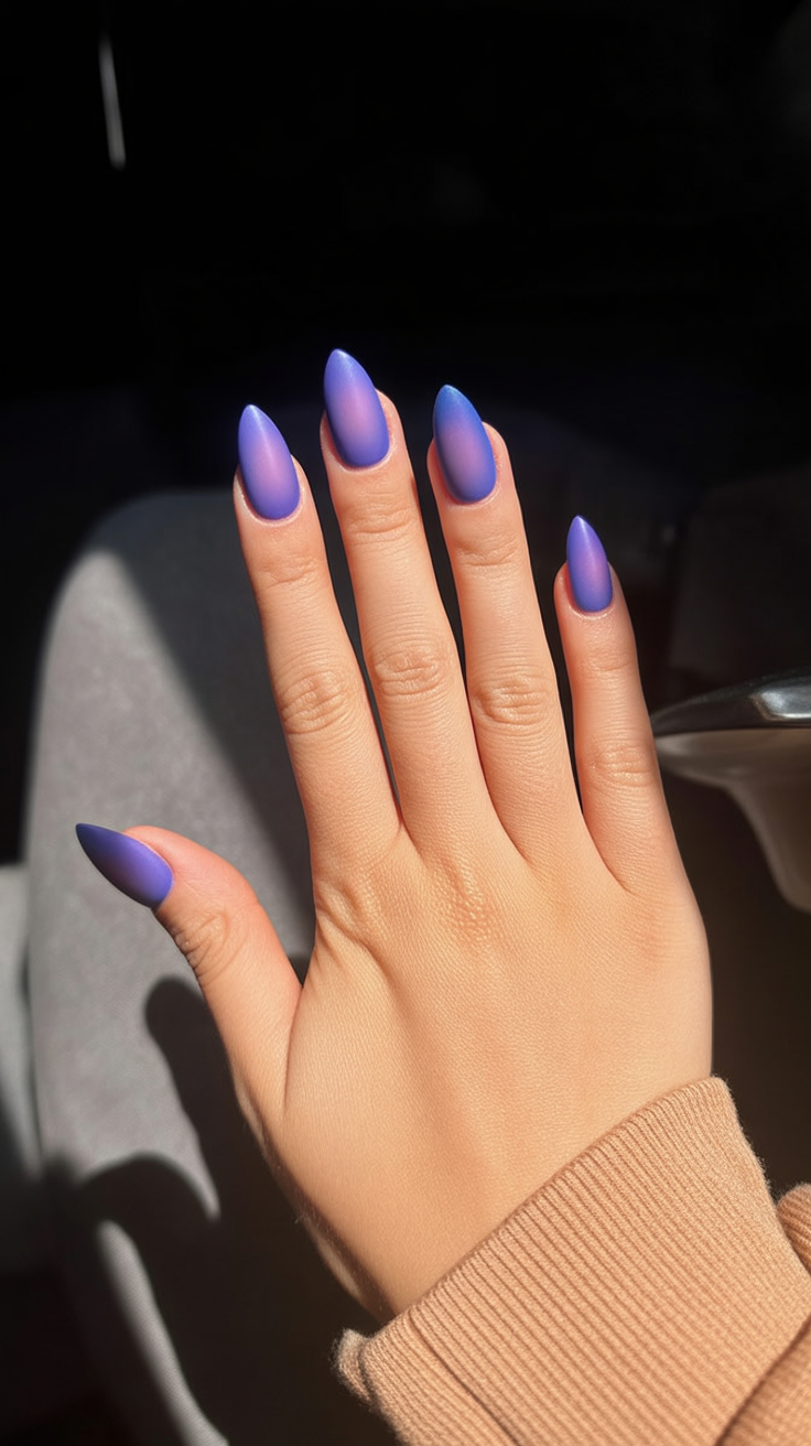 Cool and calm, this blue aura looks like twilight skies—deep at the edges, lighter toward the middle, with a modern matte haze. The stiletto silhouette adds attitude without screaming; it’s quietly confident, a little mysterious, and very aesthetic. Think city nights, knit cuffs, and that soft chill that makes everything feel crisp and elevated.