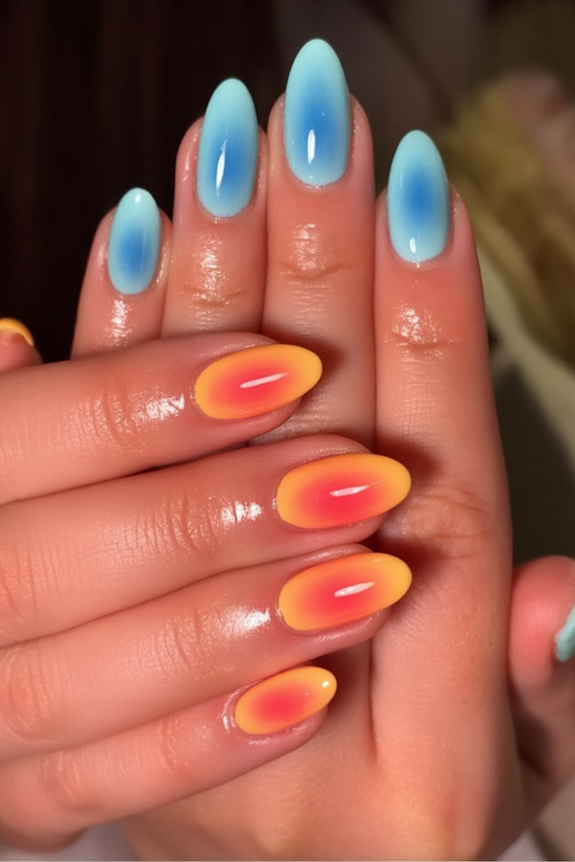 Two moods, one set: cool sky blue nails with a soft blue halo meet sunny tangerine tips glowing with orange and red centers. The contrast is playful and colorful without feeling busy, and the glossy finish makes both palettes pop. It’s an instant conversation starter and a fun way to test multiple designs in one appointment.