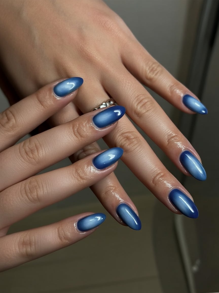 What makes it special: the aura is concentrated toward the belly of the nail, so the center glow elongates the shape. Blue stays sophisticated here because the blend is soft, not graphic. Ask for sheer navy around the sides with a lighter slate core, then cap with two layers of topcoat for depth.