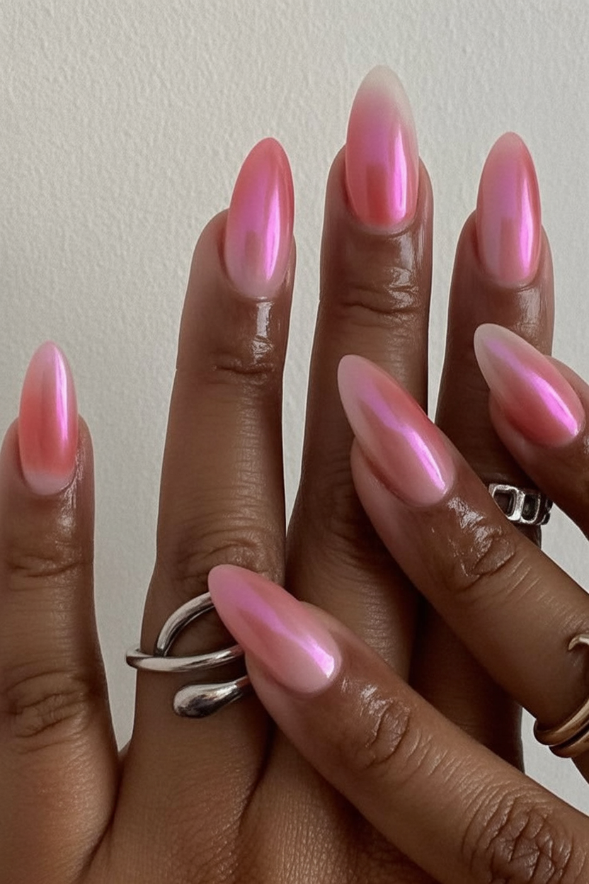 Current trends: Aura designs are everywhere for 2026, but this pink-to-light blend is the most requested because it pairs with everything from sweaters to spring dresses. To lean trendy, try a subtle chrome seal for extra bright reflection; to keep it simple, go with a neutral glossy top and let the color do the work.