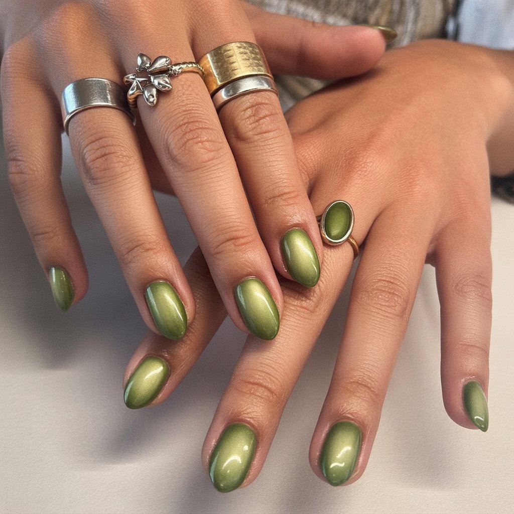 Motivation to try now: green is the quiet luxury color of 2026. It reads sophisticated, not seasonal, and the cat-eye beam adds movement without extra designs. Ask your tech to magnetize the shimmer toward the middle for that focused glow, then seal with two layers of top coat for depth and long wear.