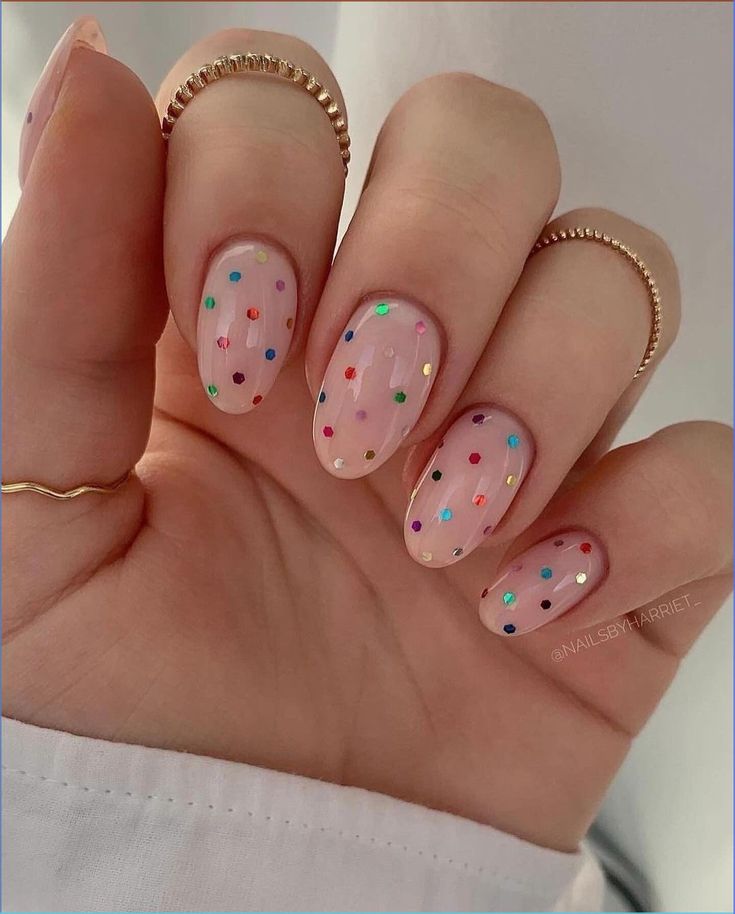 Perfect for fans of short and simple designs, this look features a neutral pink base adorned with multicolored confetti dots. The minimalist yet festive style makes it versatile for any birthday celebration, especially for those who prefer understated elegance.
