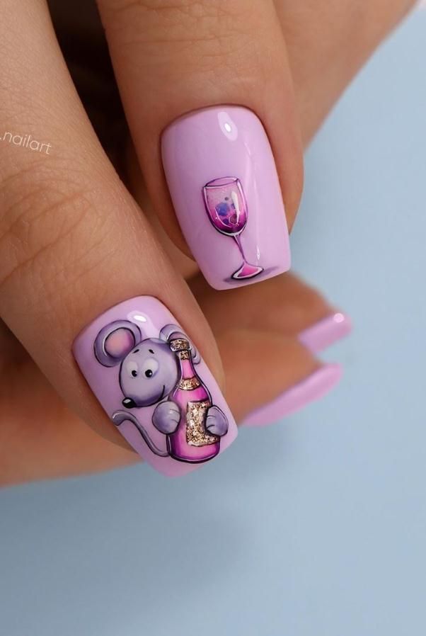 Featuring a cute mouse holding a champagne bottle alongside a sparkling wine glass, this nail art is ideal for playful personalities. Painted in soft lavender hues, it’s a whimsical and lighthearted design that’s perfect for 20th or 22nd birthdays.