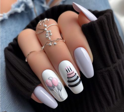 This classy and elegant design features white nails with intricate details of a birthday cake and pastel balloons. The subtle yet festive theme is perfect for more formal birthday dinners or brunch celebrations.