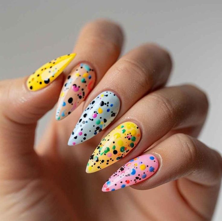 Perfect for fun and trendy personalities, this design features bright confetti dots on a base of cheerful colors like yellow, pink, and blue. The almond-shaped nails add a chic touch, making this design suitable for 18th or 21st birthdays.