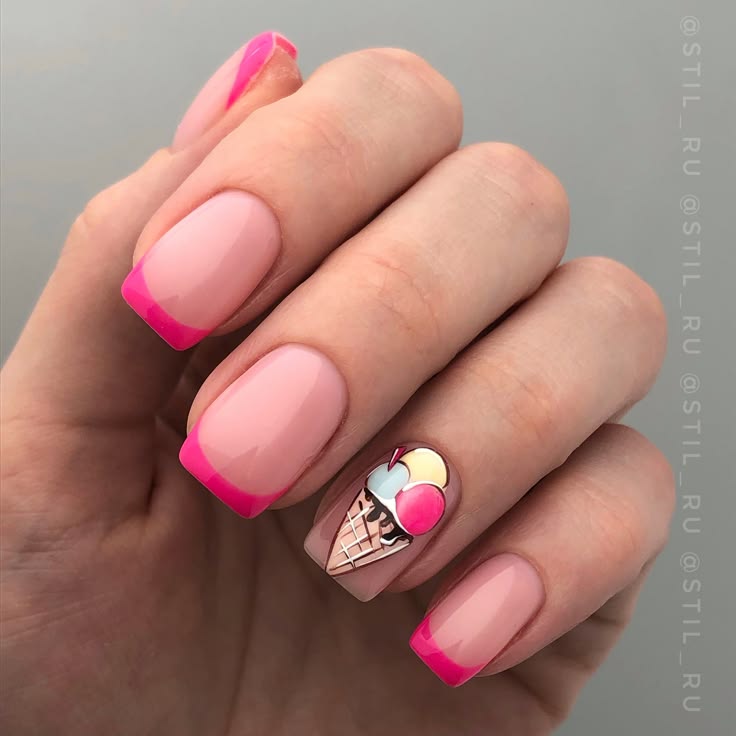 This adorable design features a cute ice cream cone accent paired with a pink French tip. Perfect for those with a sweet tooth, this look is playful, fun, and trendy, making it ideal for 19th or 20th birthdays.