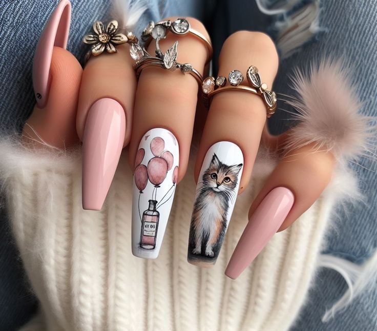 A long coffin nail design featuring a combination of delicate balloons and a beautifully painted kitten makes this nail art stand out. This look is perfect for animal lovers celebrating their 25th birthday or anyone who wants a unique and sophisticated style.