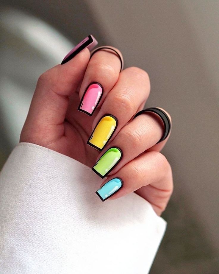 This fun and colorful nail design features bold hues of yellow, green, blue, and pink outlined in black for a comic-inspired aesthetic. The coffin shape nails give the design a modern edge, making it a hit for younger crowds or a summer birthday celebration.