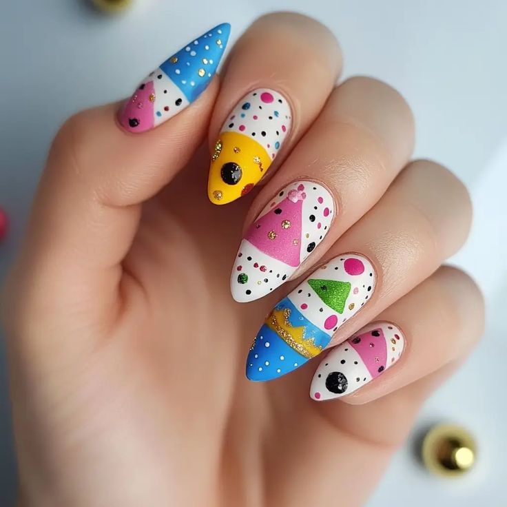 What’s a birthday without party hats? These cute and simple nails feature vibrant party hat patterns mixed with confetti-like dots in bright colors. Perfect for birthdays in summer or fall, this look is playful yet polished.