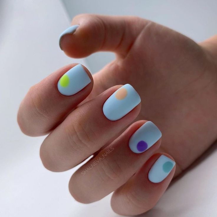 For fans of minimalist nail art, this design features soft blue nails with playful polka dots in various colors. The short, clean style ensures that the nails are cute and classy, making them perfect for those who want something subtle for their 23rd or 18th birthday.