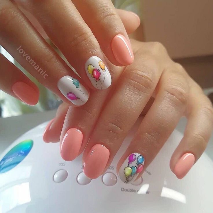 These coral nails feature a glossy finish with accent nails showcasing multicolored balloons on a white background. The cheerful design is great for a 19th or 20th birthday in summer, offering a perfect blend of youthful energy and sophistication.