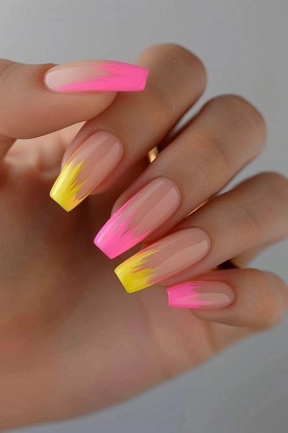 This long coffin-shaped design showcases vibrant neon ombre tips that transition from hot pink to yellow, creating a bold yet stylish look. The gradient effect is paired with a glossy nude base, making it a fantastic choice for summer birthdays or vibrant personalities.
