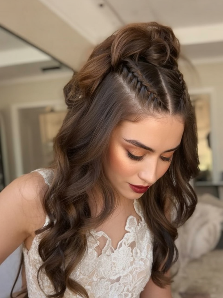 There’s something effortlessly romantic about this half-up braid look. The gentle waves, combined with braided sleeks on the scalp provide a high-tasteful casual look, which is ideal to wear to a wedding, brunch, or even a night out on the town. It is the sort of style that you just can not wait to twirl in your dress, because your hair is perfectly styled with just enough polish and play.