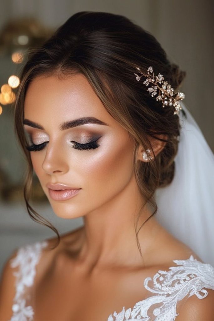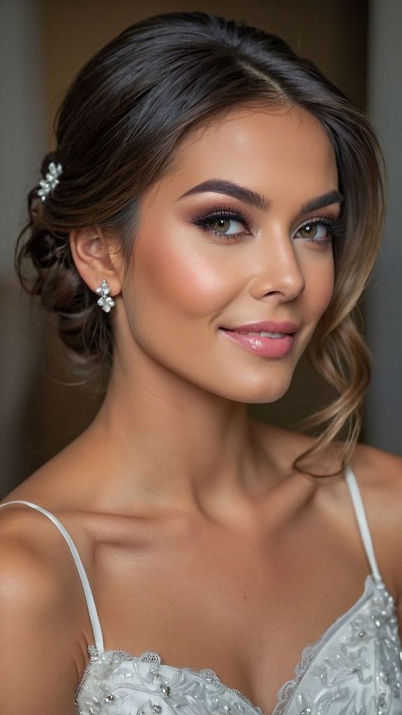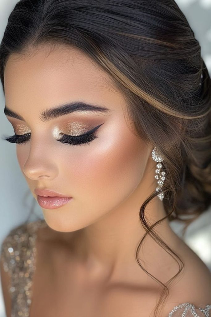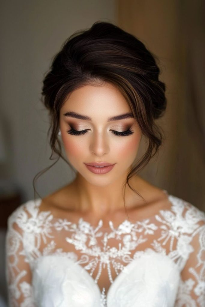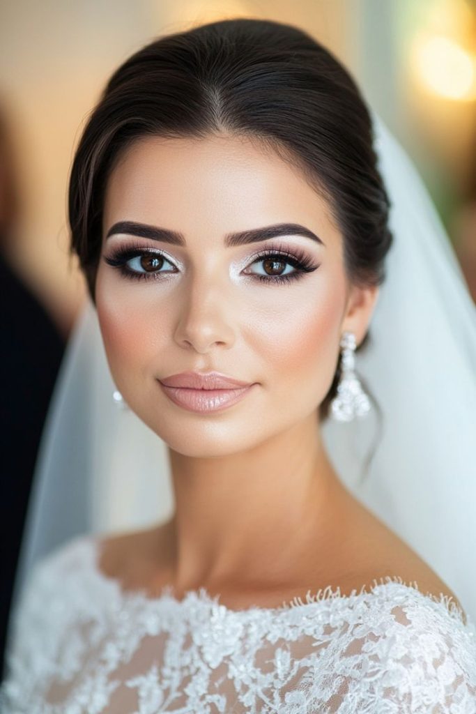 Ideal for brides with brown eyes, this look pairs beautifully with champagne or ivory gowns. Use a hydrating primer and luminous foundation to achieve the glowing base.