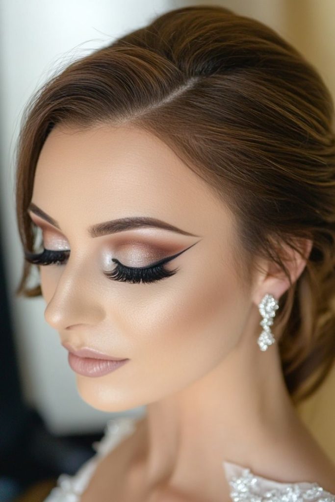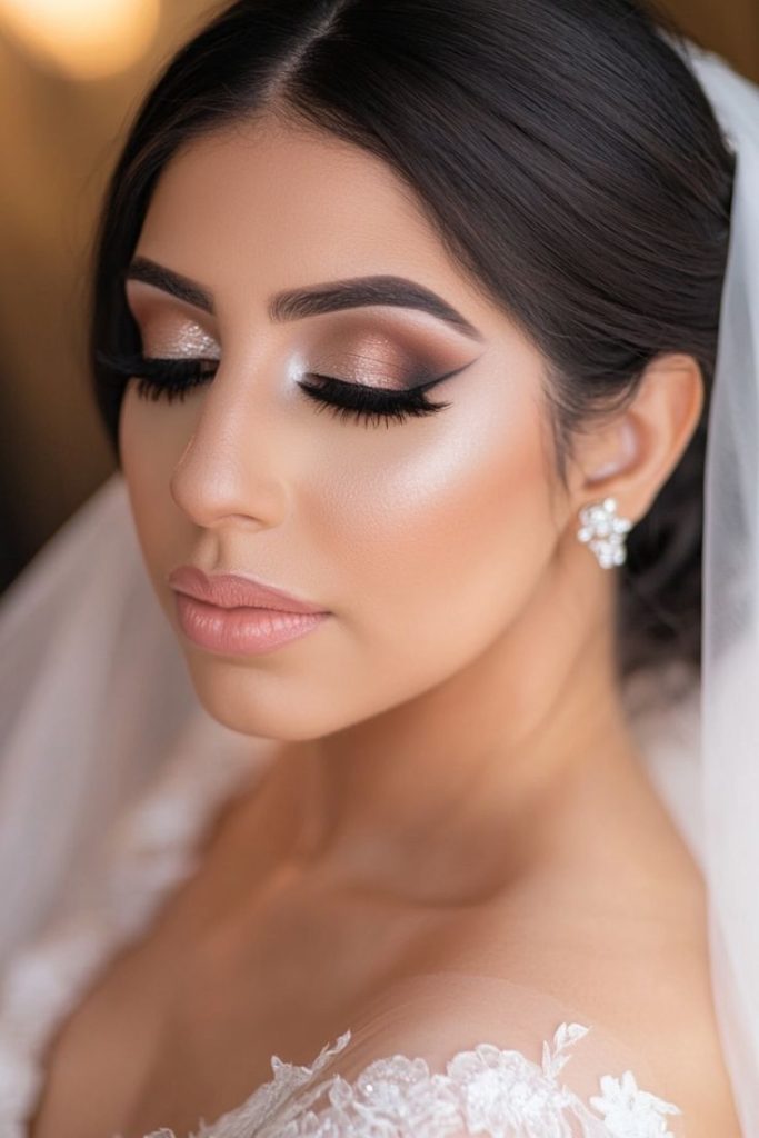 For brides who want to stand out, this look features bold eyeliner and a flawless matte base. Smokey eyes in warm bronze tones create depth, while a rosy blush and highlighter emphasize the cheekbones. The lips are kept neutral to balance the dramatic eyes, ensuring a chic and contemporary appearance.