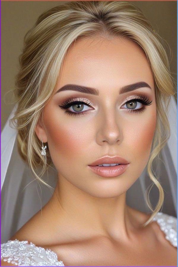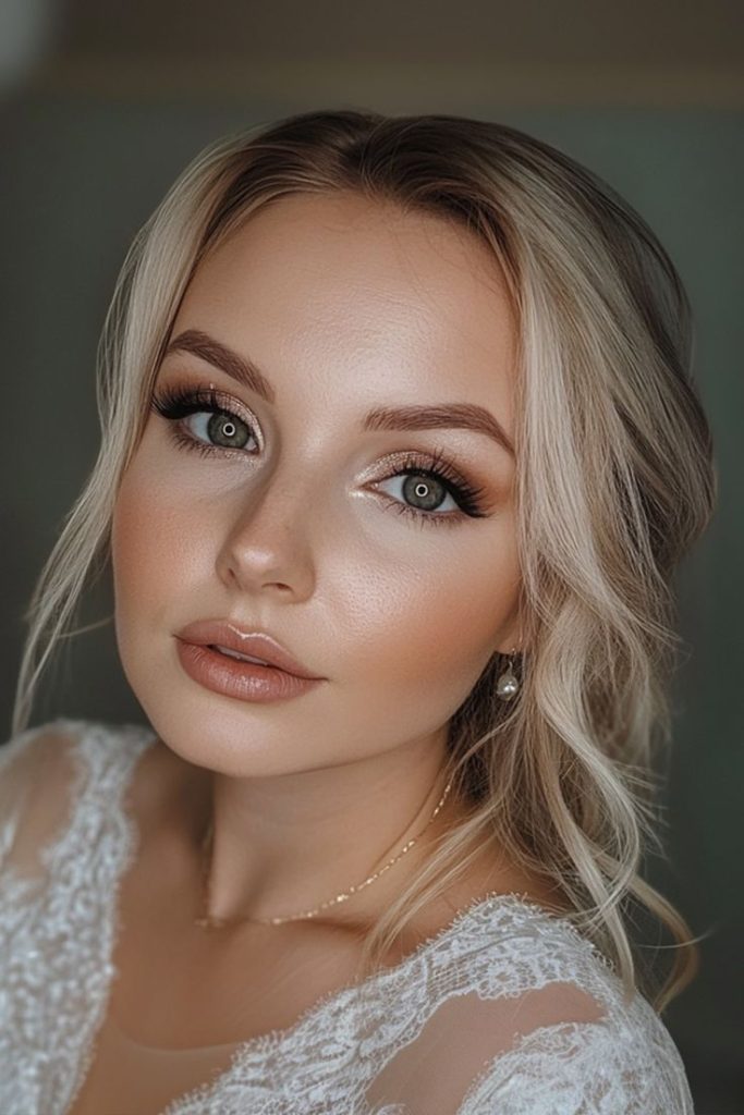 This makeup style complements green eyes and lighter skin tones, making it perfect for spring weddings. Incorporate fresh floral accessories to amplify the romantic theme.