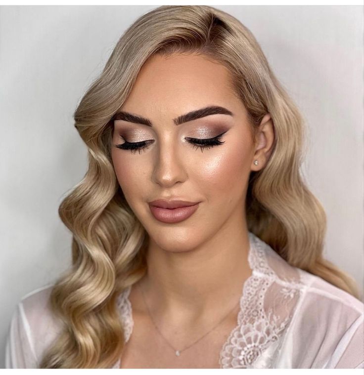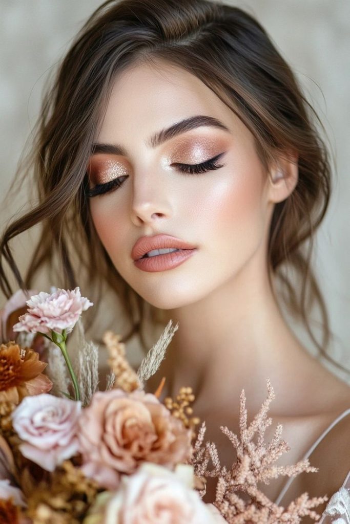 This look combines classic bridal makeup elements with modern touches. The eyes are highlighted with shimmer shadows, and the lips are painted in a soft rose shade. The base is luminous, with a hint of highlighter on the cheekbones.