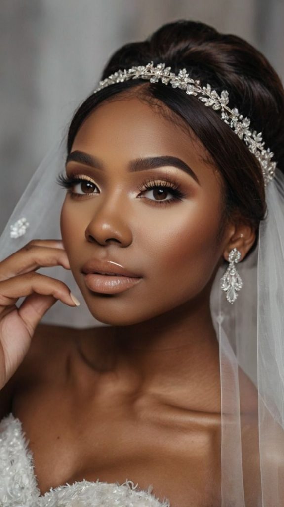 This makeup look celebrates the beauty of black women, emphasizing bold features with dramatic elegance. The bride’s skin is glowing, with a radiant finish that enhances her natural tone. Her eyes are accentuated with deep, smoky shades and fluttery lashes, creating a striking look. A glossy nude lip adds a touch of softness, while her jeweled headpiece and veil complete the regal aesthetic. Perfect for brides who want a look that’s both bold and sophisticated, making them feel like royalty on their wedding day.