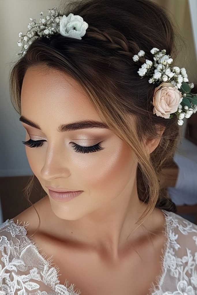 This makeup look features a radiant glow with dewy skin and peach-toned blush. The eyes have a soft shimmer, and the lips are painted in a light coral shade. The addition of floral accessories enhances the romantic feel of this look.