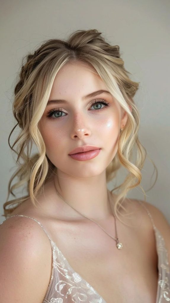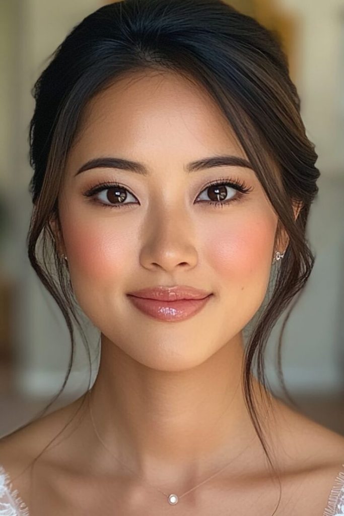 This makeup celebrates understated elegance. Lightly bronzed skin, barely-there eyeshadow, and a glossy lip create a fresh and youthful appearance. The hairstyle—a loose bun with wispy strands—enhances the effortless charm.