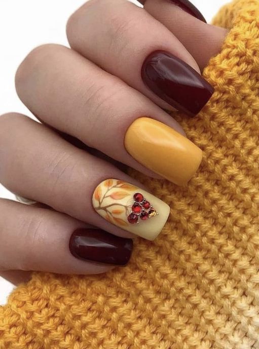 For a sophisticated yet fun look, try a combination of bright red fall nails with deep burgundy and rich yellow. This design features a mix of solid burgundy nails and bright yellow accents, with an intricate fall-themed nail art on one nail that showcases autumn leaves and tiny red berries. It’s a perfect blend of elegance and playful fall bright nails almond style, ideal for those who love a classic look with a modern twist.
