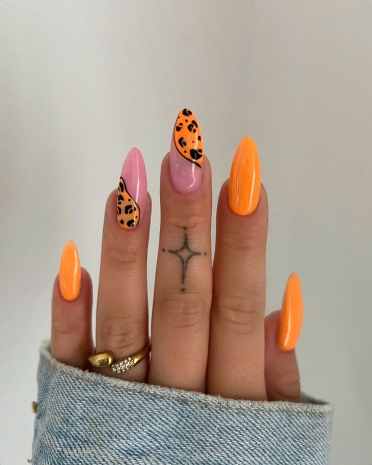 Combine neon colors with animal print for a bold and trendy look. This design features a mix of bright pink, orange, and leopard print accents, creating a fun and playful style. It’s perfect for those who want to add a bit of edge to their fall nails and embrace bright colored fall nails.