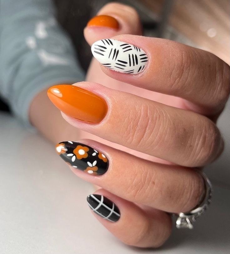 This chic design combines black and white patterns with bright orange accents. The mix of geometric and floral patterns adds a touch of sophistication, while the bright orange nails bring in the fall vibes. It’s a versatile look that works for any occasion.