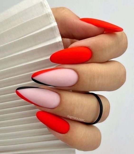 For a modern and artistic look, try this design featuring red and pink nails with black accents. The sleek and stylish combination of colors makes this a perfect choice for those who love contemporary nail art. It’s a bold and sophisticated look that’s sure to stand out.