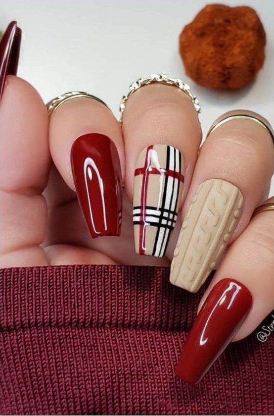 This cozy design features plaid patterns and cable knit textures, perfect for the fall season. The mix of red, beige, and black creates a warm and inviting look that’s great for the colder months. It’s a unique and creative design that’s sure to impress.