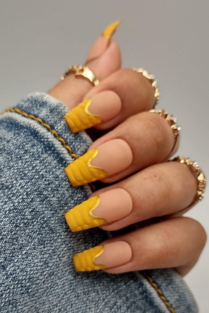 Yellow nails get a unique twist with textured accents in this design. The bright yellow color is complemented by a textured wave pattern on the tips, adding an interesting and tactile element to the nails. This acrylic nail design is perfect for those who want to add a bit of texture to their bright colors for fall nails.