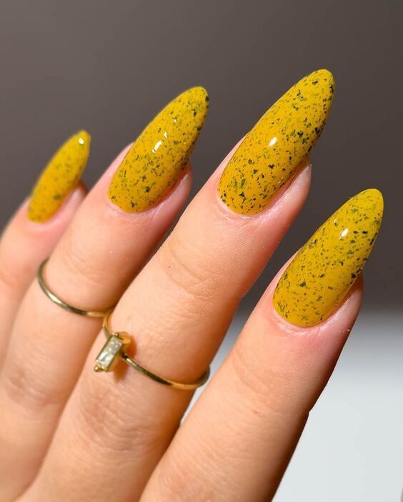 Yellow nails are elevated with a speckled pattern in this design. The bright yellow base is dotted with tiny black speckles, creating a fun and playful look. This design is great for those who want to try something different and embrace bright colors for fall nails.