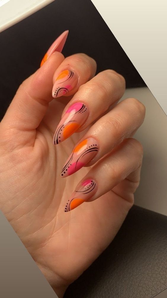 For a creative and artistic look, try this abstract art nail design. The mix of pink, orange, and black colors creates a dynamic and eye-catching style. It’s perfect for those who love unique and fun nail art ideas and want to showcase their creativity.