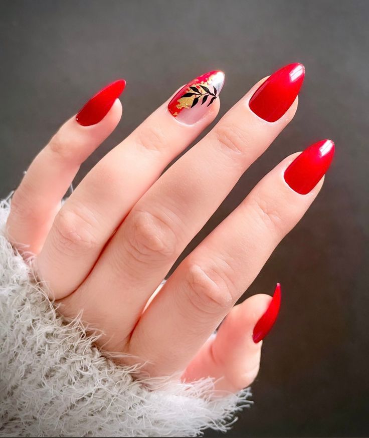 For those who love bright red nails for fall, this classic red manicure is elevated with a single accent nail featuring a delicate leaf design. The simplicity of the bright red nails combined with the detailed leaf art makes this look both timeless and trendy. It’s a perfect example of how simple can be stunning, and it’s a great way to embrace the fall season without going overboard.