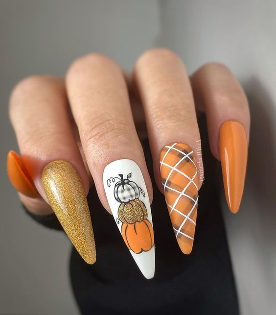 Embrace the Halloween spirit with this playful design featuring pumpkins and plaid patterns. The orange and white color scheme is perfect for the season, and the detailed pumpkin art adds a fun and festive touch. This cute nail art idea is great for those who love to celebrate the holidays with their nails.