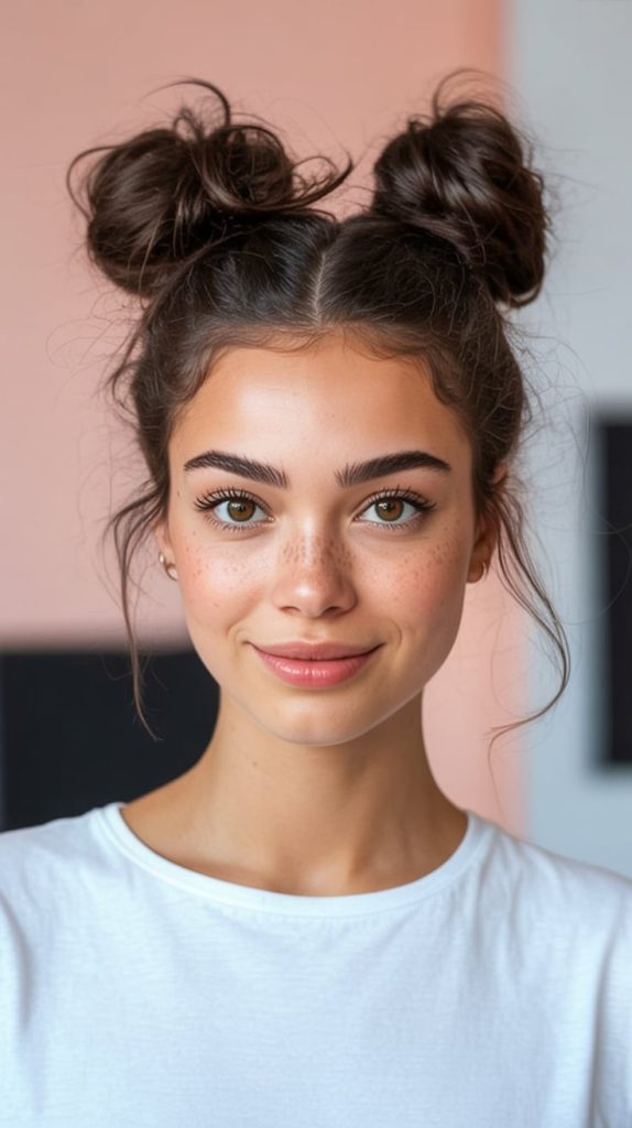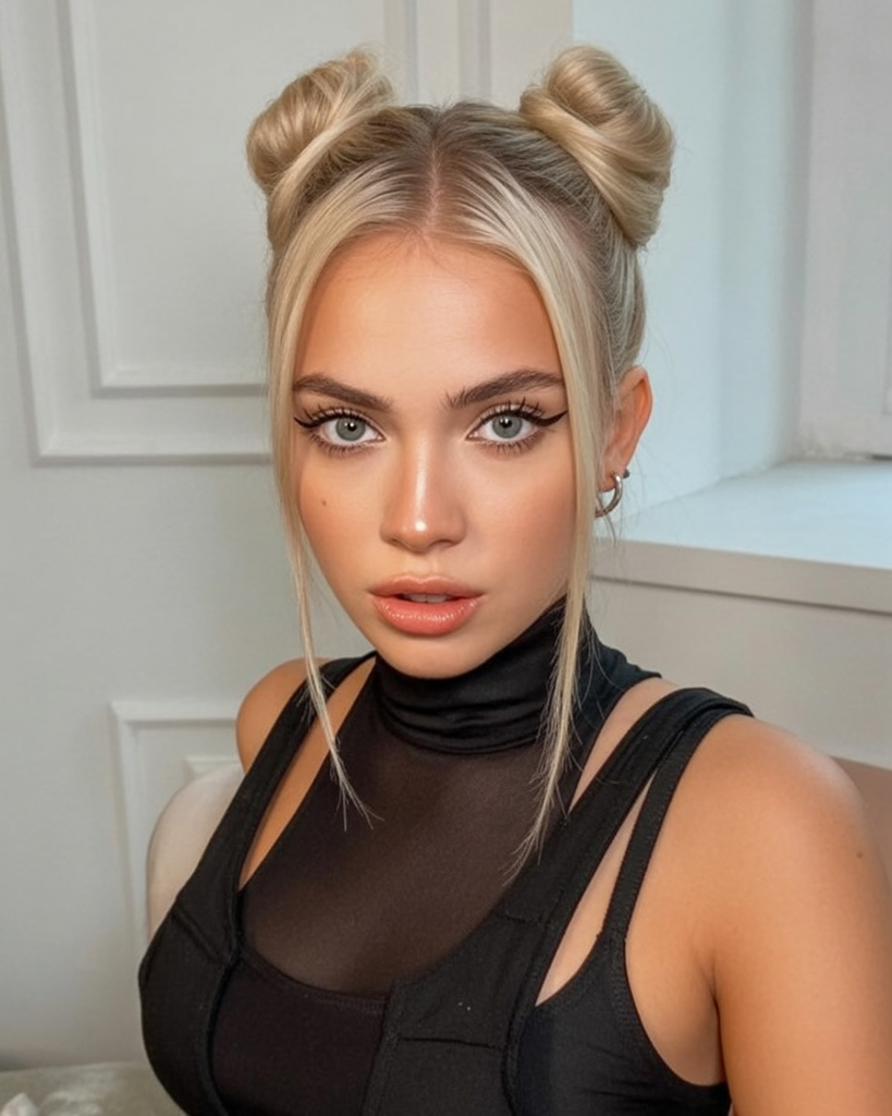 Fun and loose, these sloppy space buns exude carefree vibe. It is ideal when you want to relax or when you want to be creative because of its slightly undone texture.