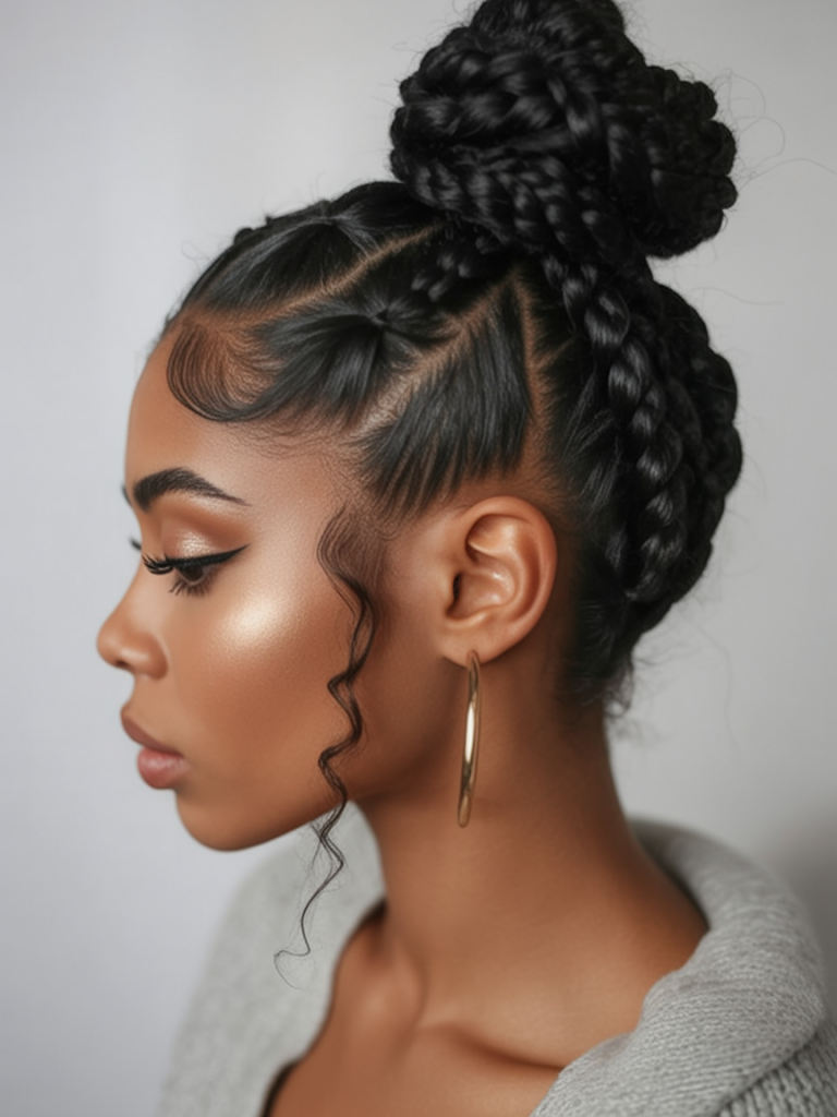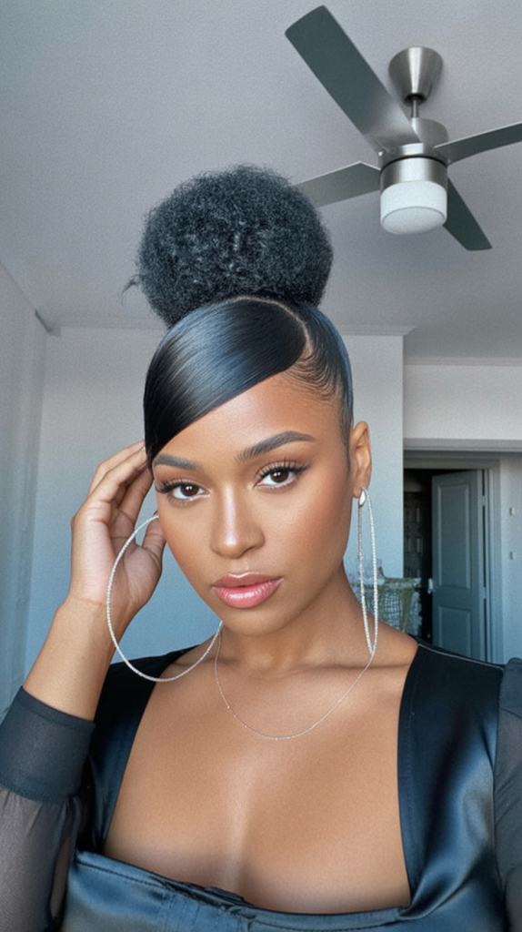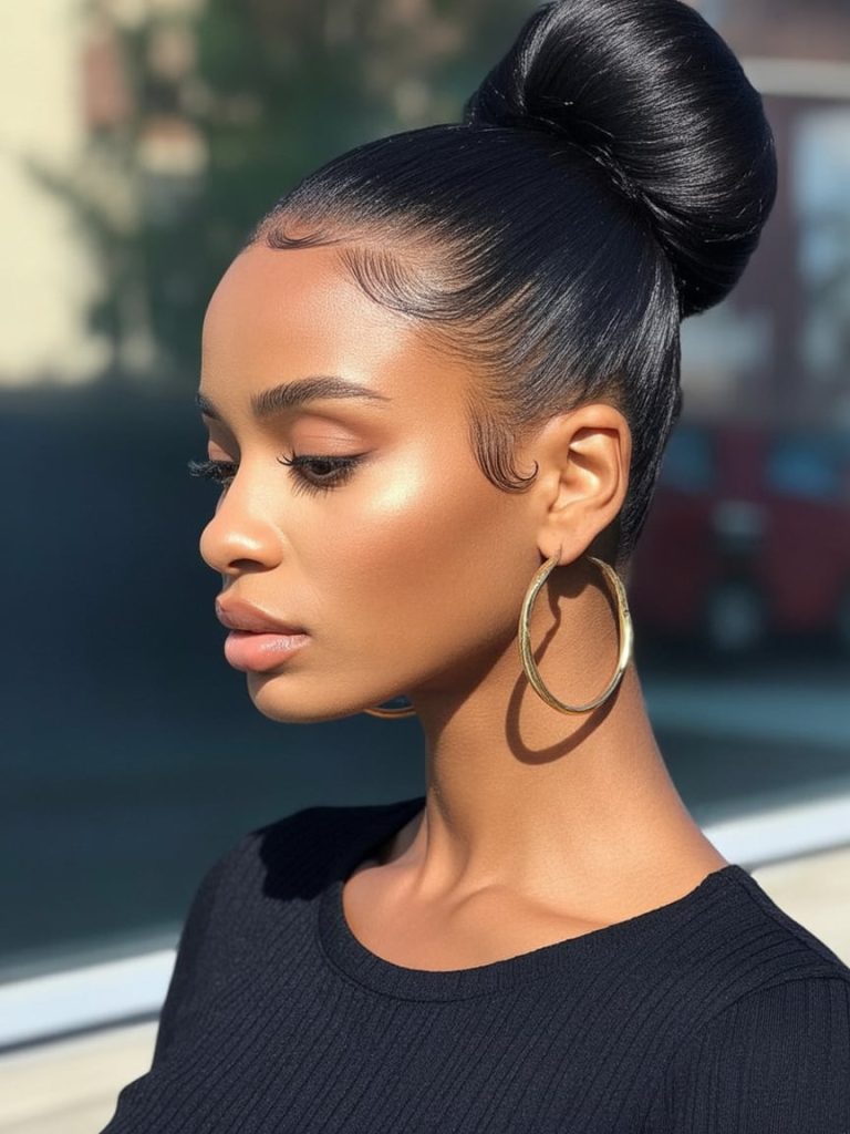 This bun is ideal on black women who desire to wear the natural texture as it may be constructed using stretched hair or a textured puff. When the sides are styled into side bangs and there are smooth edges it has a formal low bun look, which is good whenever one wants to go to a wedding or some special evening.