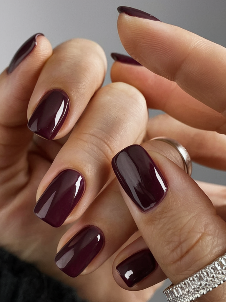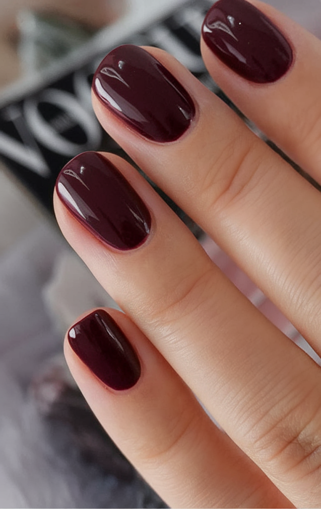 Who said short nails can’t be luxe? This deep, dark burgundy manicure on a compact squoval shape proves that style isn’t about length — it’s about intention. The high gloss finish is salon-fresh, making this look clean, elegant, and so easy to live in.
